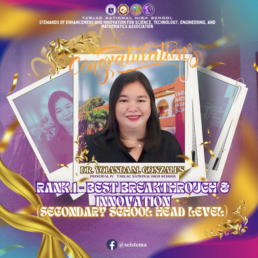 Earning Rank 1 for Best Breakthrough & Innovation (Secondary School Head Level), Dr. Yolanda M. Gonzales has shown us that leadership is not only about holding a position but about creating lasting impact to the lives of students with passion and courage.