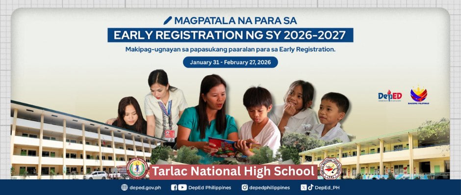 Tara na at magpatala sa Tarlac National High School para sa Early Registration para sa darating na School Year 2026-2027. Magdala lamang ng kopya ng Birth Certificate ng mag-aaral at pumunta sa Guidance Office.