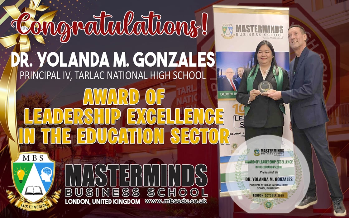 Dr. Yolanda M. Gonzales, Principal IV of Tarlac National High School, was named Best Principal of the Year at the 26th World School Summit held at the House of Lords in London—an international recognition of her leadership in building inclusive, globally aware, and high-performing school environments.